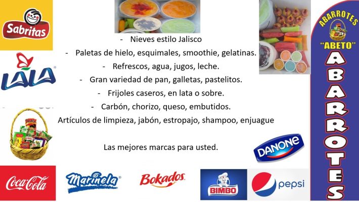 Más allá de la comida, también ofrecemos una amplia variedad de abarrotes, frutas, verduras, refrescos, bebidas y todo lo necesario para el hogar, todo en un solo lugar conveniente. Si no encuentras lo que buscas, no dudes en preguntarnos, porque hacemos todo lo posible para satisfacer tus necesidades.